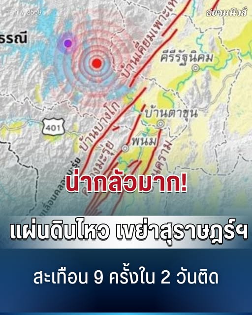 12 กุมภาพันธ์ 2569 ศูนย์ปฏิบัติการธรณีพิบัติภัย กรมทรัพยากรธรณี กระทรวงทรัพยากรธรรมชาติและสิ่งแวดล้อม รายงานเหตุการณ์แผ่นดินไหวที่เกิดขึ้นในพื้นที่จังหวัดสุราษฎร์ธานี